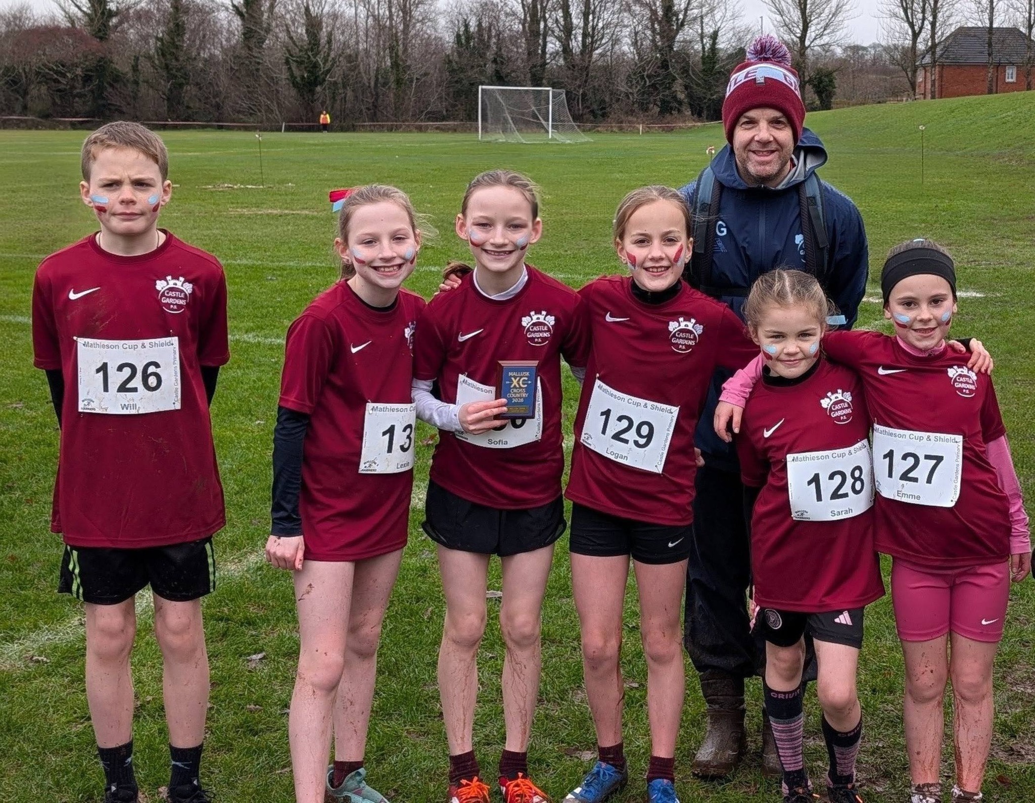 Next up, our Girls' Team were keen to follow up their fantastic second place team at Londonderry Park with another stellar performance and my goodness did they deliver. From the start, the Castle Gardens runners began to impose themselves on the race with Sofia, Logan and Lexie placed well inside the top 20 places. Not far behind them, Olivia and Sarah were running strongly together with Emme just a couple of footsteps behind. Finishing the first lap, Sofia had moved into 2nd place with Logan now in 5th and Lexie also inside the top 10. Olivia and Sarah were just inside the top 20 with Emme now having moved into the top 30 places also. As the mud began to take its toll, our amazing girls made their final charge. Sofia went on to take the lead with 200m to go and established a commanding and convincing winning margin. Logan had now soared to an excellent 3rd place, a position she unfortunately just lost in a photo finish but this was a remarkable run from an amazing athlete who had just returned home late the night before and must surely have still been feeling the impact of jetlag from her long journey. Lexie also made a superb charge for the finish line, resulting in a personal best 6th place finish- another outstanding performance. Olivia (13th) and Sarah (20th) both finished strongly and looking remarkably composed in the very testing conditions, belying their relative inexperience. Our final finisher, Emme, was not far behind at all and showed remarkable tenacity and resilience when, as she charged past a fellow competitor in the home straight, the mud claimed another victim. Despite face planting the ground, Emme was straight back to her feet to complete the final few steps of the race as quickly as she could in an amazing 31st position. As a result of these magnificent efforts, the Castle Gardens Girls' Team finished 1st out of 32 teams- an amazing feat.